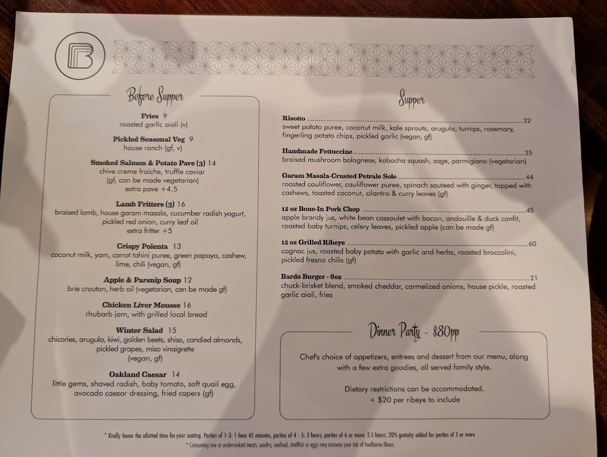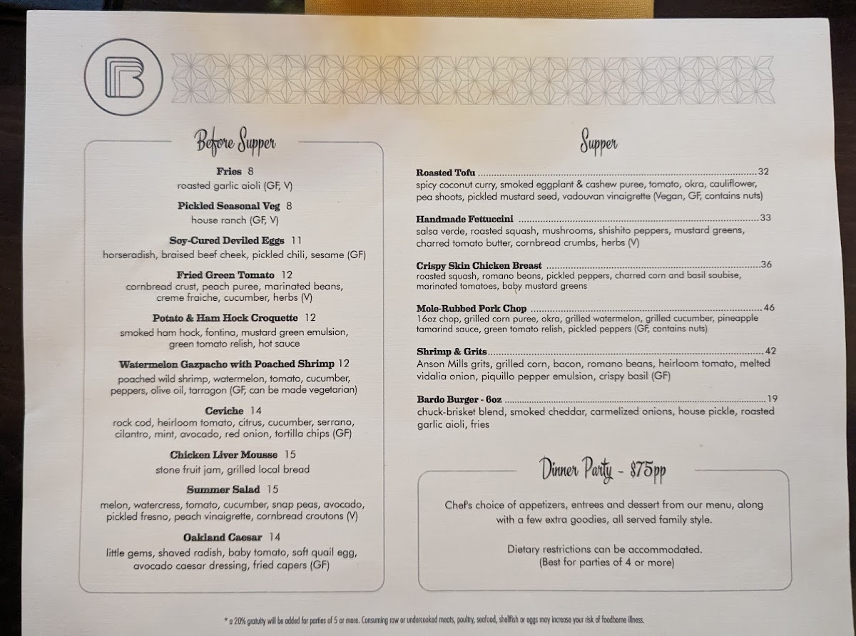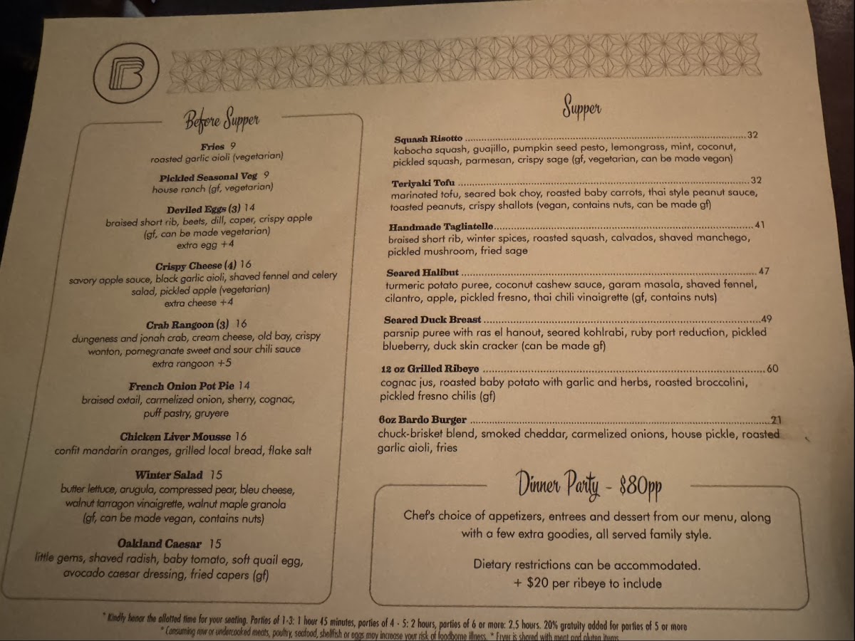 Bardo Lounge & Supper Club in Oakland is a refined yet inviting American restaurant and bar that excels at crafting an exceptional dining experience. The menu strikes a perfect balance between innovative and comforting, featuring standout dishes like the rich chicken liver mousse paired with fresh strawberries and bread, as well as the earthy chicken and grits enhanced by savory mushrooms. The ribeye steak, veg risotto, and sole also receive high praise for their depth of flavor and impeccable execution.